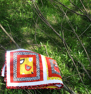 Love the hippo among the chickens. The black white red with yellow is one of my favorite combos. This is such a great quilt and it looks great with its twin.